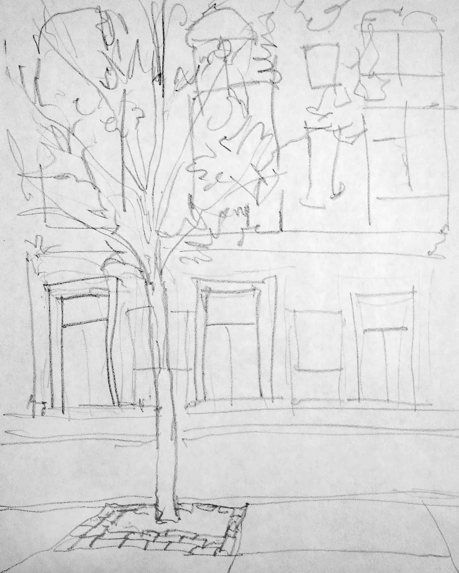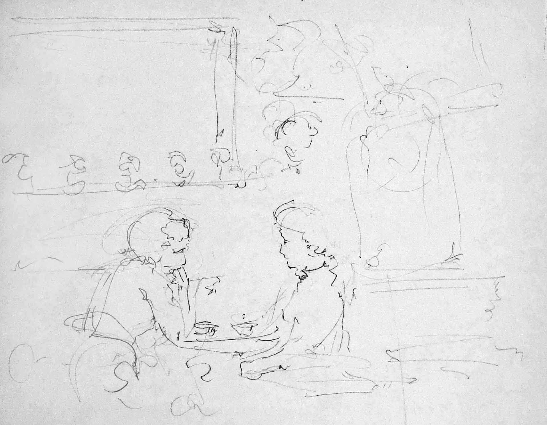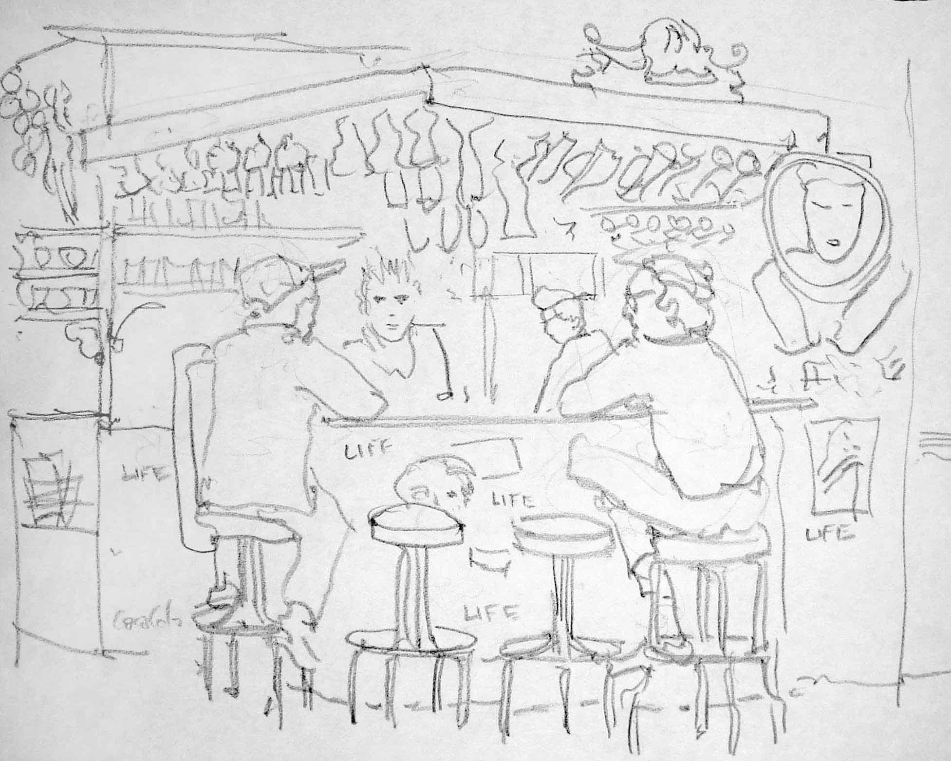 Sketched from life. The cafe is a fixture on the northeastern corner of