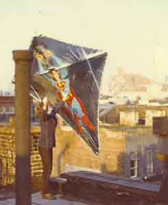 Superman, Oil on Mylar, 72" x 120", 1978, Christopher Reeve as Superman an alien orphan sent from his dying planet to Earth. The kite was flown on the day of the premier in New York City.