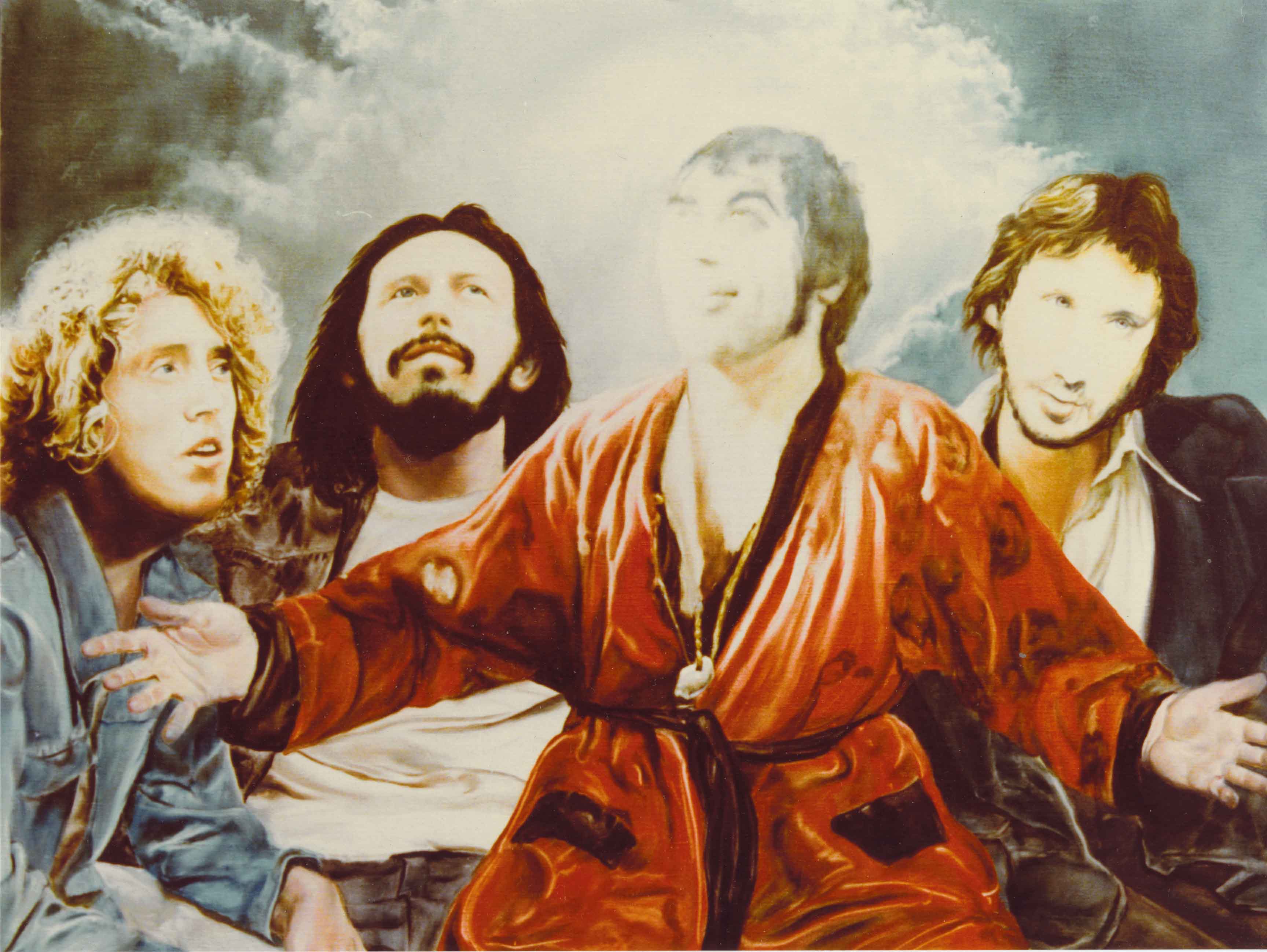 The Who, 48" x 36", oil on canvas, 1979, Painted from images taken during the premier of "The Kids Are Alright." In just a few days Tom painted and presented the work to Clive Davis of A&M. He gave him tickets to the Who concert at Madison Square Gardens. Tom had the painting signed by Pete Townsend on the back. The work was stolen and its whereabouts are unknown.